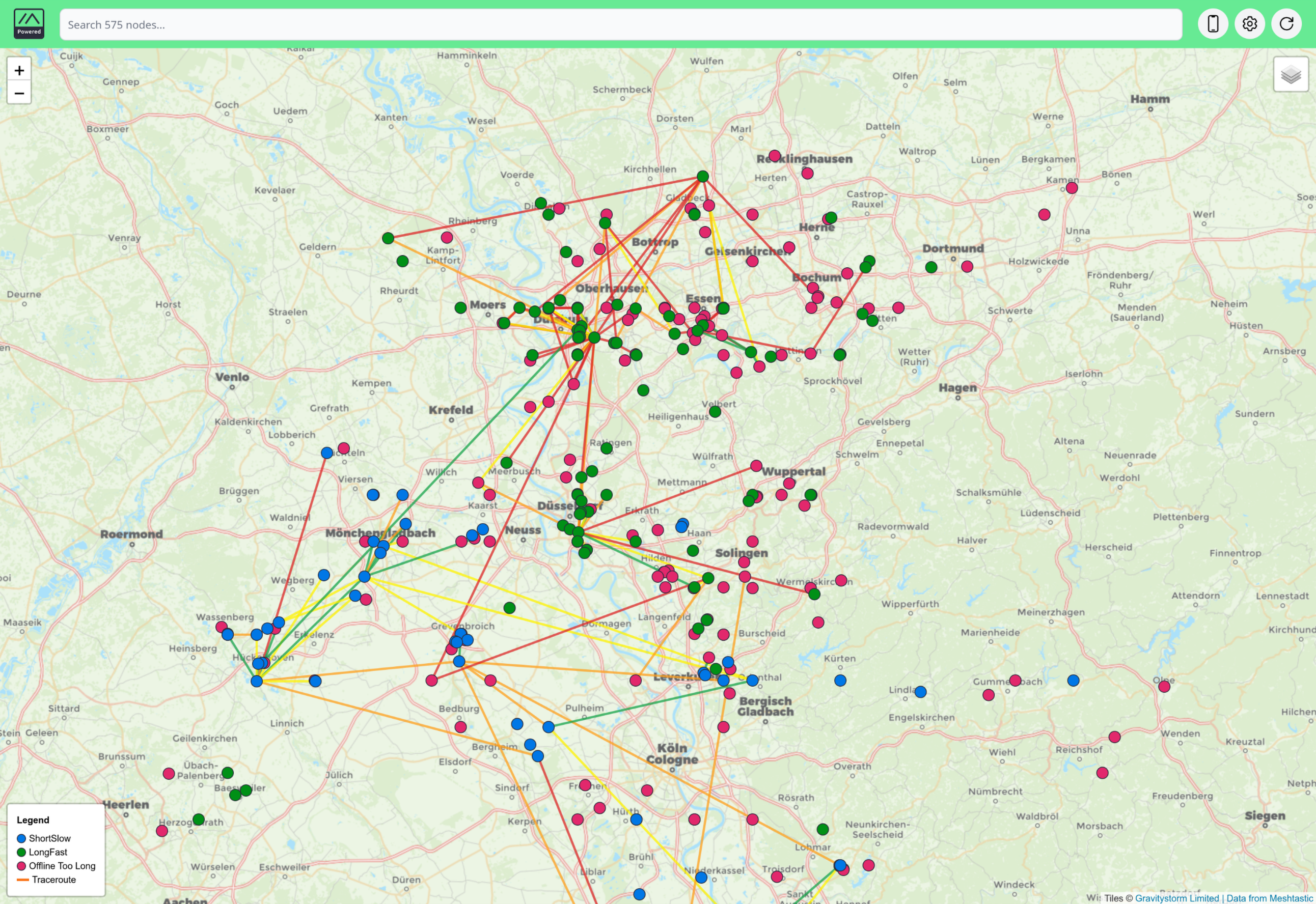 - "Neighbours" map layer. Shows blue connection lines between nodes that heard the other node.